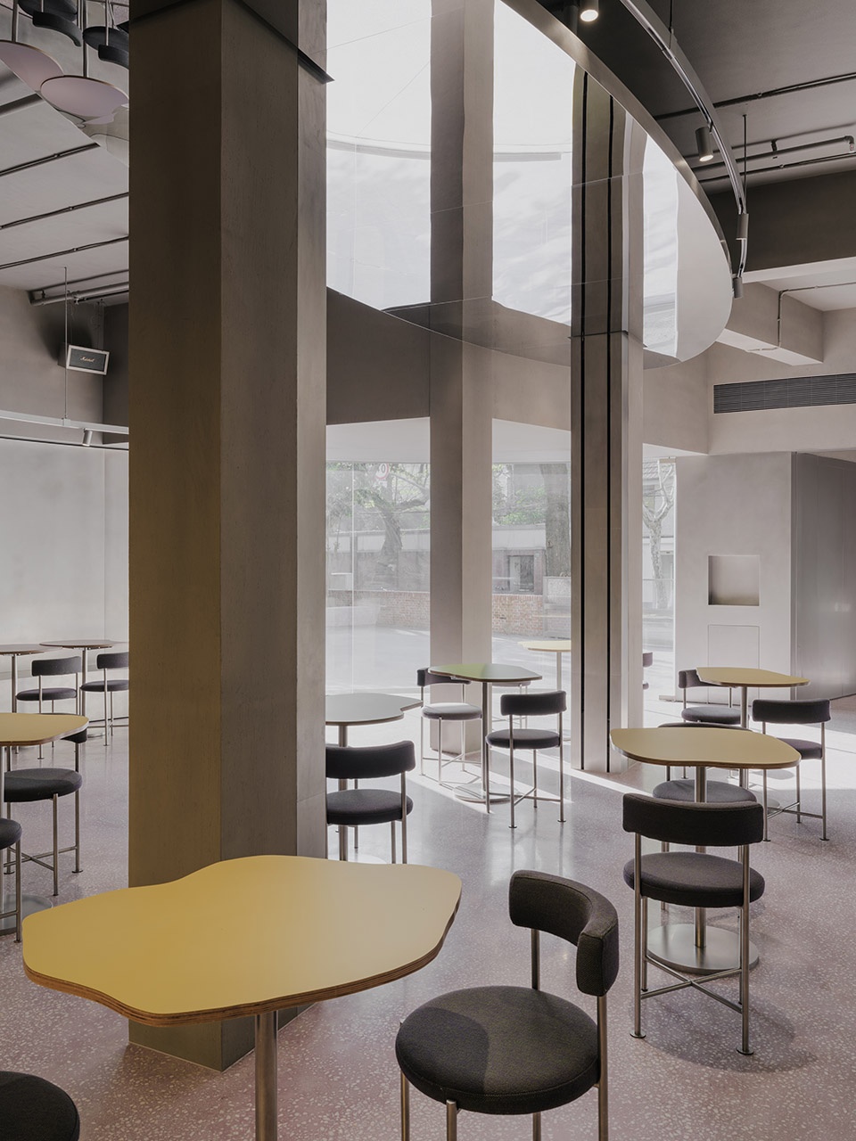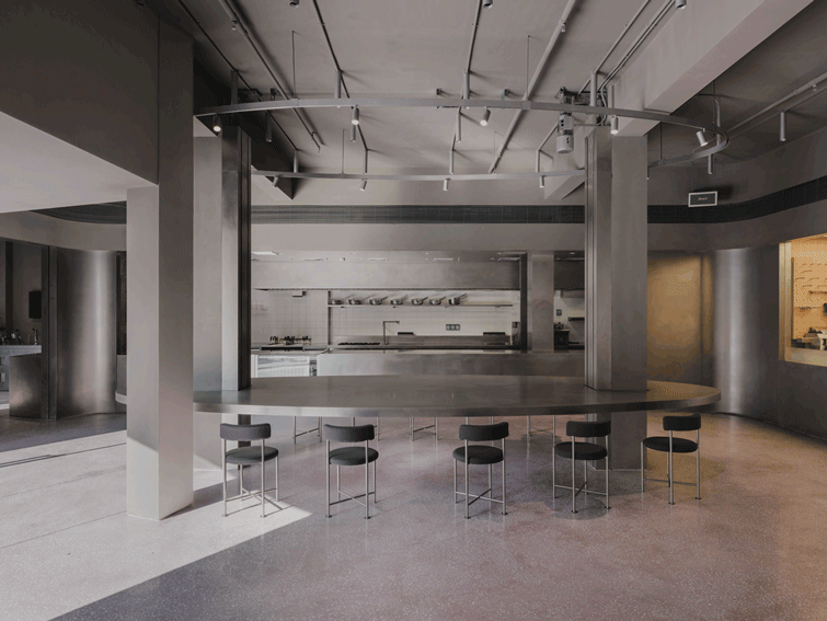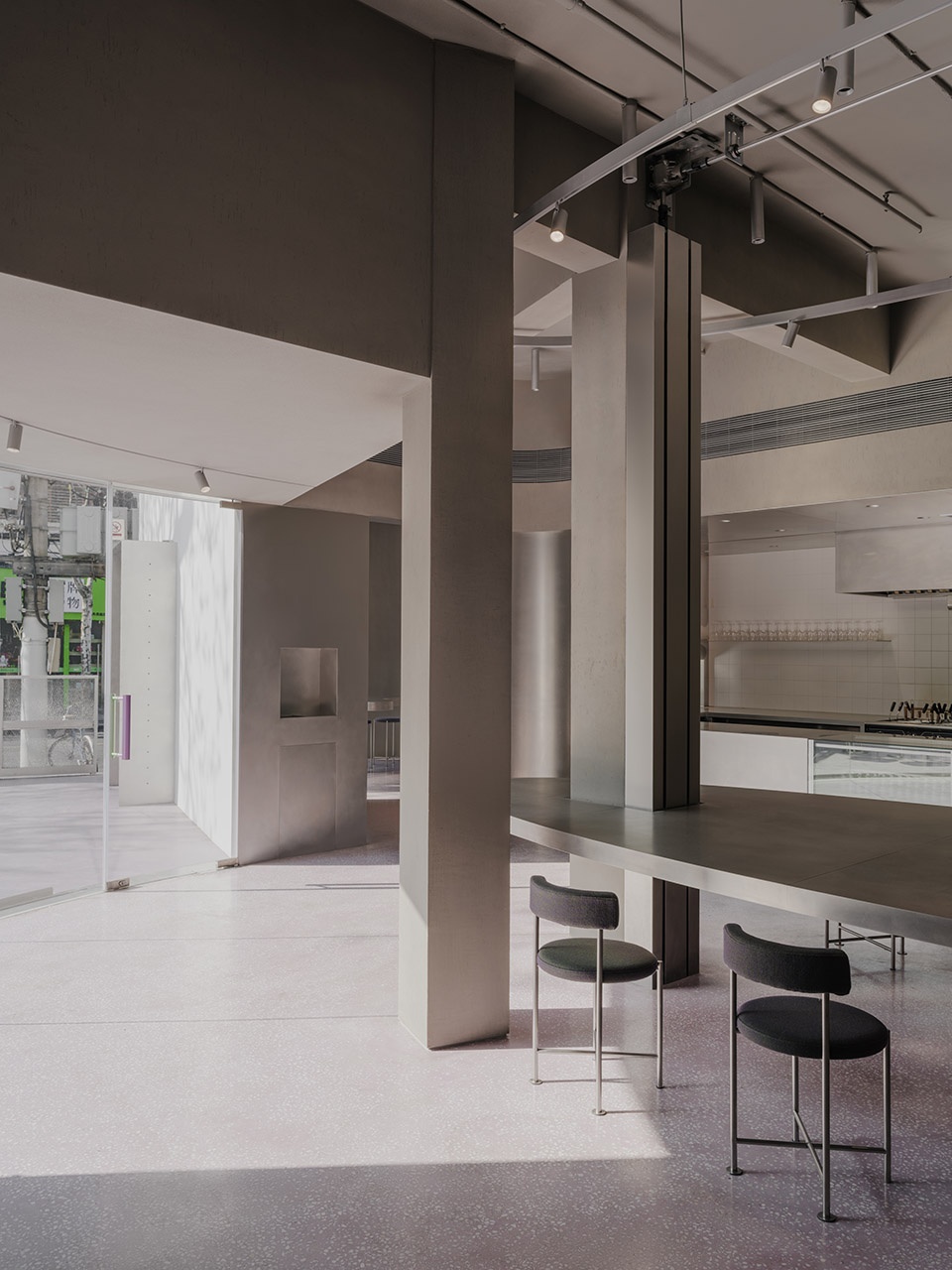应接不暇的空间体验源自于不同类型的工作同时发⽣,也源于组成这个个性独特品牌的个体们。在动线的规划上我们研究了主厨Jeremy的工作流程,依墙而建的巨大L型厨房不仅理性地规划了厨房动线,同时组织了空间,为厨师团队创造了通透规整的开放式舞台,也让用餐区的食客们有机会近距离观察和体验厨房内分秒必争的紧张氛围。切割后厨不锈钢表皮,嵌入一个发光盒子,为手工意面师和烘焙师创造出一个聚焦舞台。与厨房空间连通着的是半独立咖啡空间,不规整L型吧台延续着主空间布局且与厨房吧台相连,为主餐区输入咖啡血液也预留出更多的活动可能性。