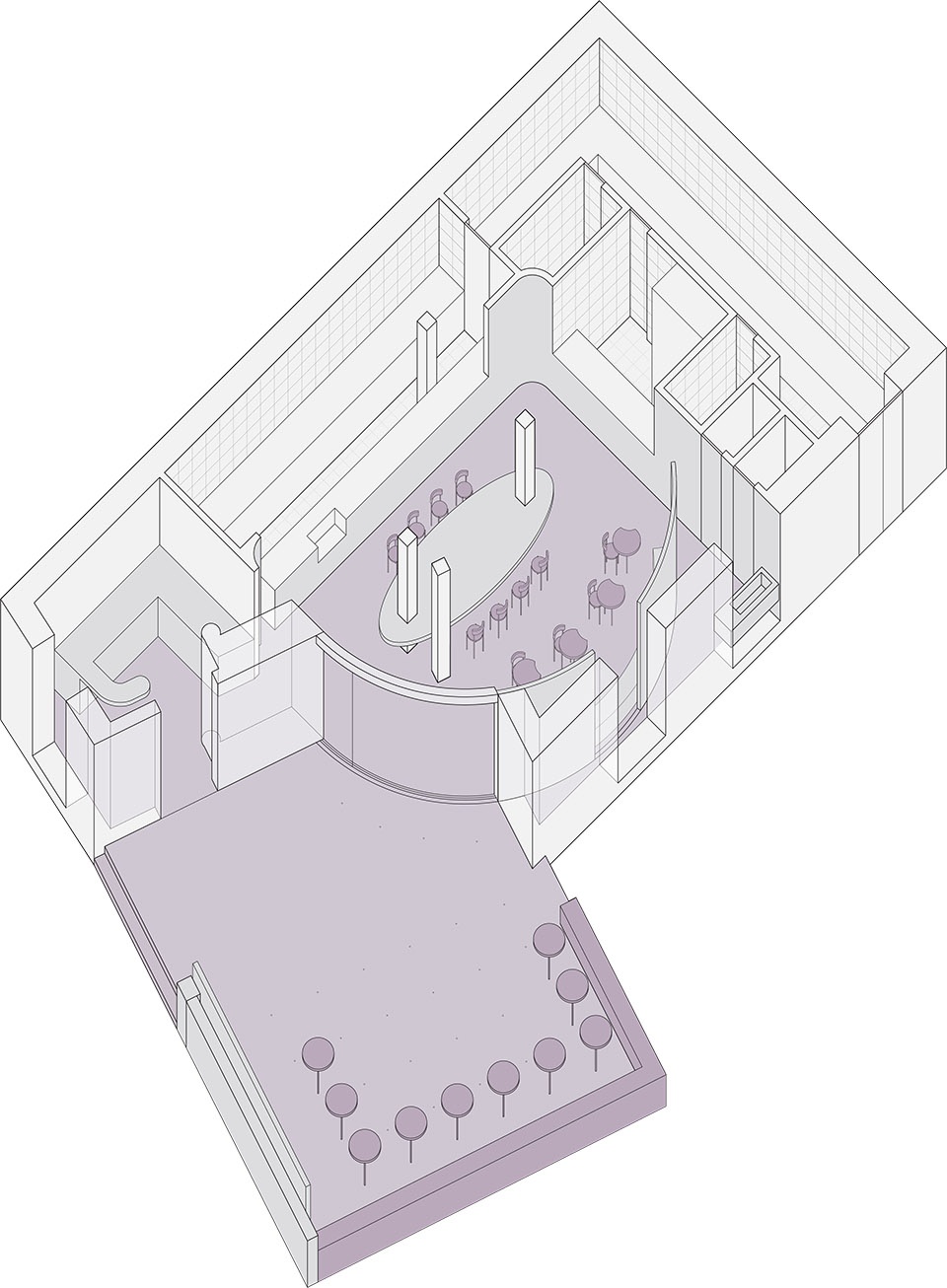 原始建筑入口被室内矩阵和平行于街道的直线切割成尖锐的内嵌直角,两根结构立柱成为进入空间的动线阻隔,我们首要解决的问题就是如何扩增室内空间的净深。通过切割原始立面打开室内空间,嵌入通透的圆形体块创造出宽阔的开放入口。弧形玻璃把更多的自然光线引入室内,增加室内空间深度的同时也与户外空间产生更多的链接。在原始建筑上切割出⼀道门,打破单调留白的立面也成为半独立咖啡空间的入口。