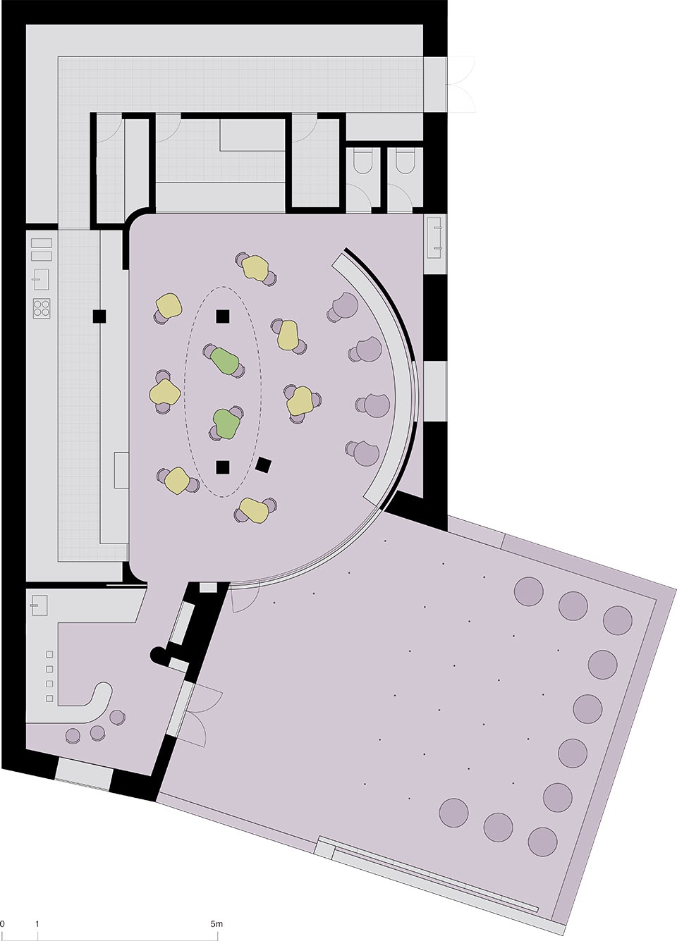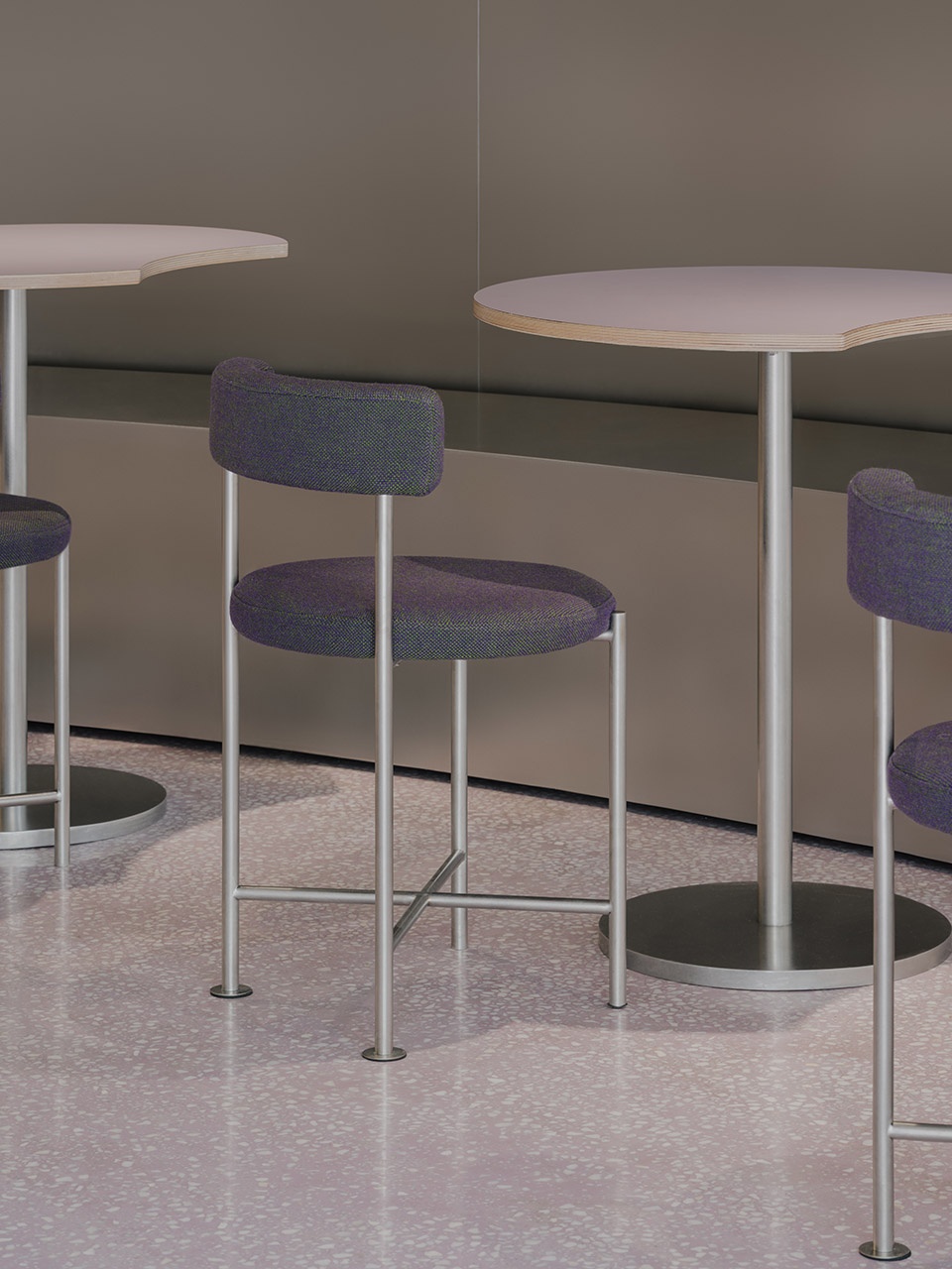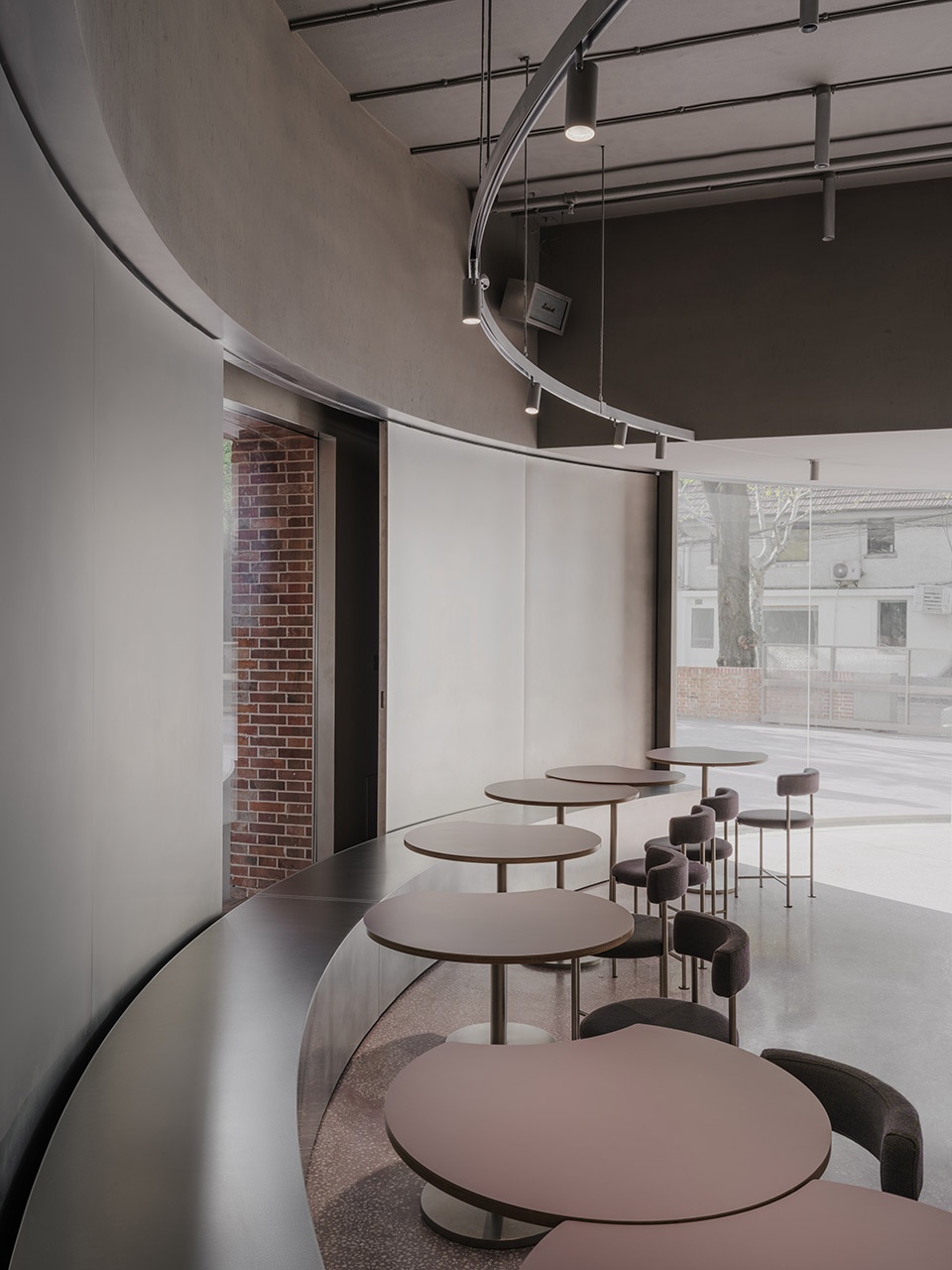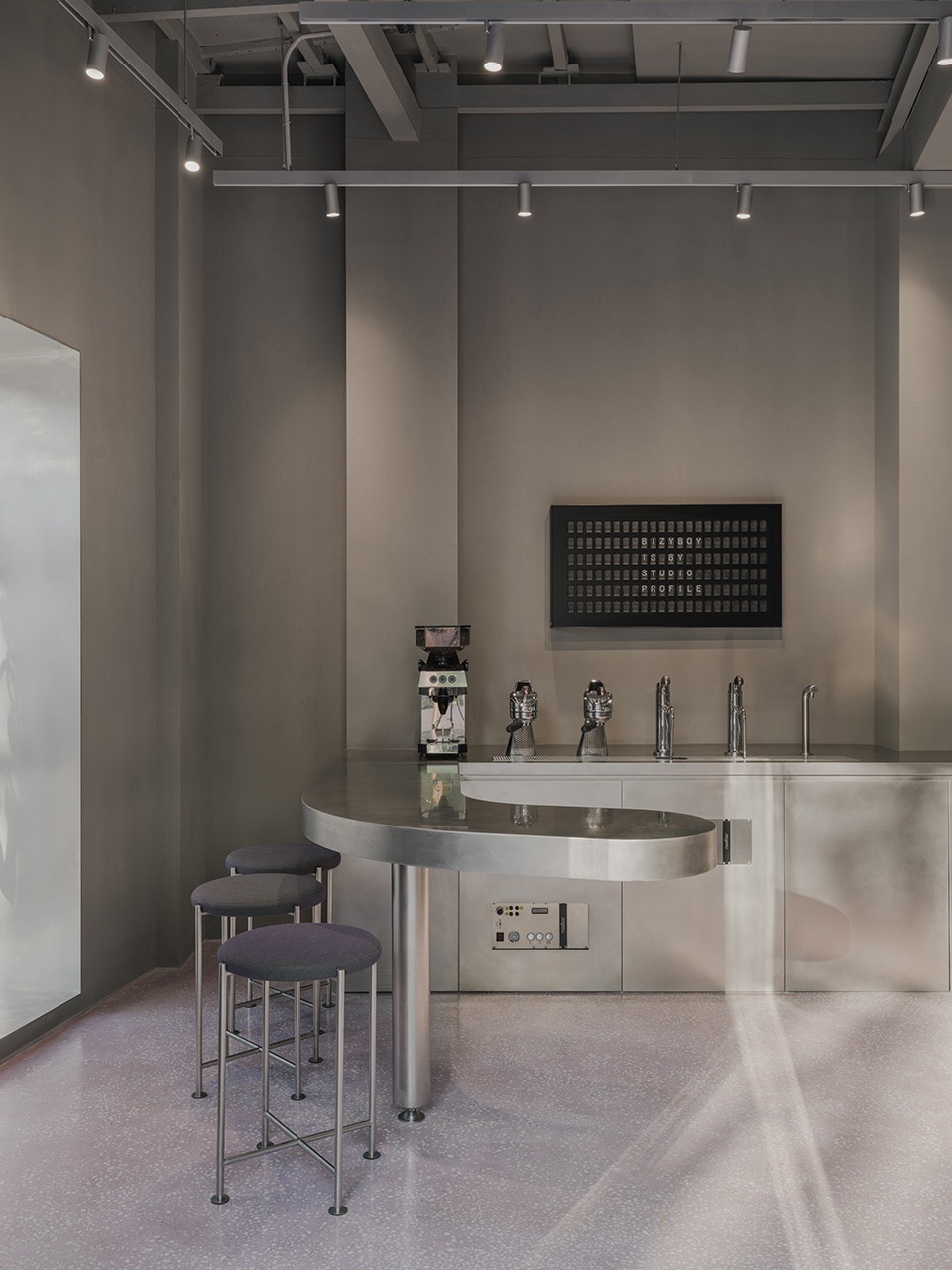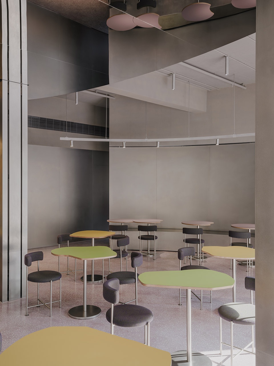 从踏入进空间的第⼀刻,踩在脚下的淡淡紫灰色就为每⼀位到访者创造着轻松的氛围。空间用色与基调的思考源于我们如何构建这个时髦又古怪的男孩形象,基于创始人也基于Bizy Family的每⼀位家庭成员。包裹着用餐区的不锈钢表皮拥抱着整个空间成为主要基调,淡紫色的水磨石地面统一着半独立的咖啡空间和主用餐区,配色各异的异型桌椅为空间带来独特的用餐体验,依照空间秩序排布的照明默默的成为氛围配角,材质和配色在空间中各司其职,平衡协调着空间氛围。