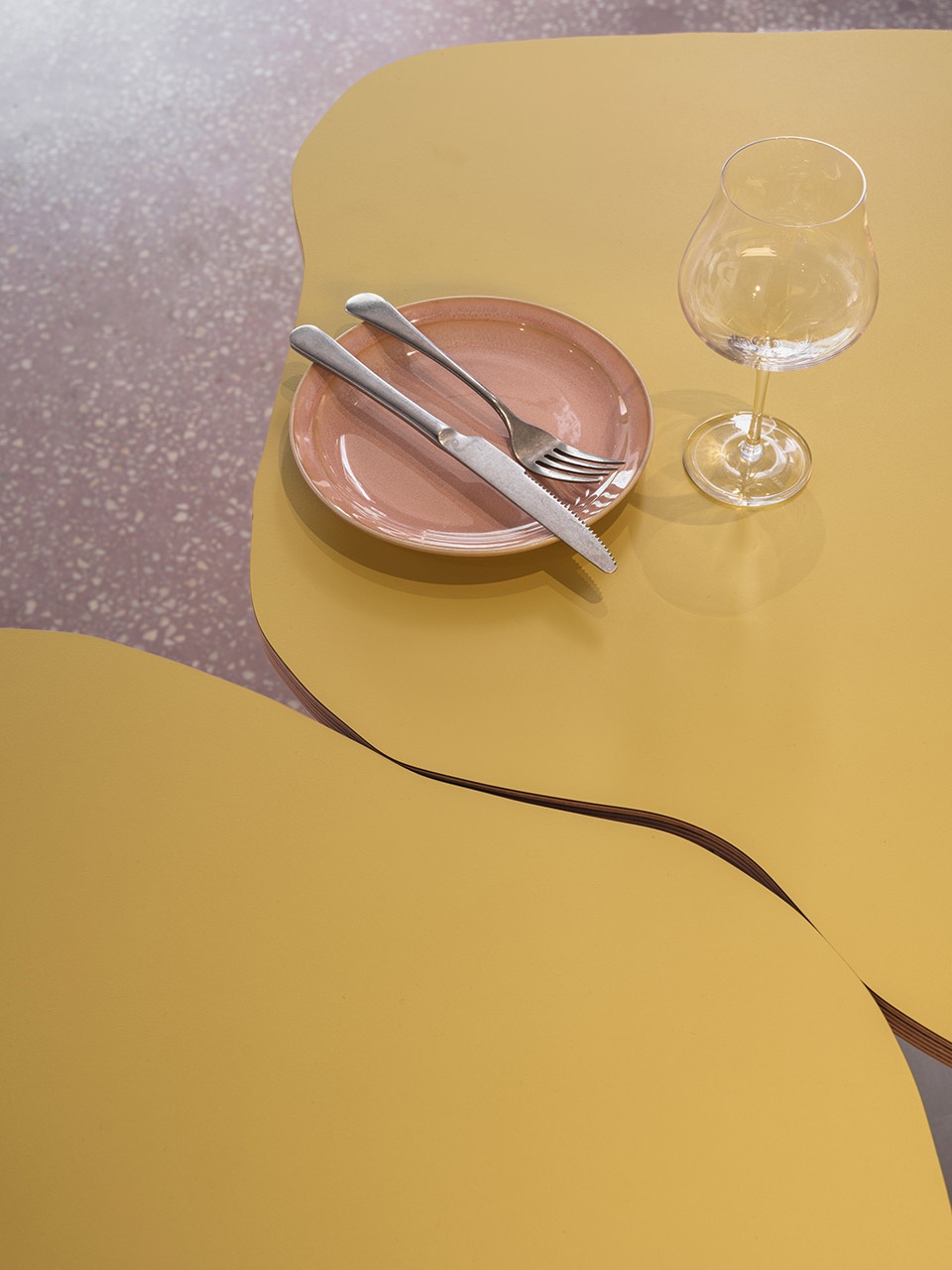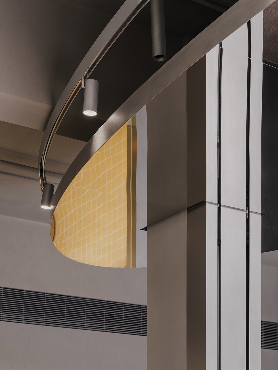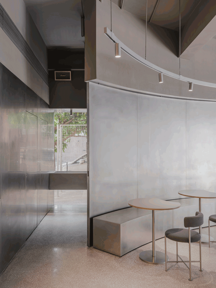 在品牌构建初期便已明确营业模式,白天贩售三明治轻餐,夜晚摇身变为意面餐厅。变动的营业属性也成为我们设计的灵感,如何在空间中创造白天与夜晚完全不同的氛围和体验也成为我们此次项⽬的课题之⼀。巨大的椭圆升降桌占据着大半个用餐区,魔术般横跨且连接着两根建筑结构柱,结构柱也成为隐藏升降机构的秘密。桌子降下,食客们围绕着巨型不锈钢椭圆桌欢声笑语,成为连接空间、食物与人际的桥梁。桌⼦升起,巨大的镜面不锈钢反射着空间的高度,带来⼀丝互动趣味。空间中的可移动弧形隔墙亦是分割空间的另一个戏法。呼应着其兄弟品牌BAsdBAN的门头,当紧闭的弧形不锈钢门被推进室内空间,彰示着每日营业的开始也在室内空间中巧妙地成为分割⽤餐区与洗手间的功能屏障。